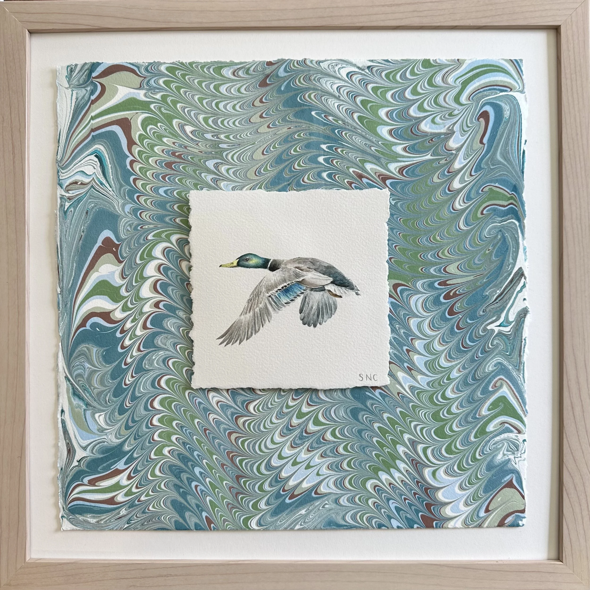 Quack. Watercolor and hand-marbled paper. Float mounted in a natural wood gallery frame. 14x14 inches.