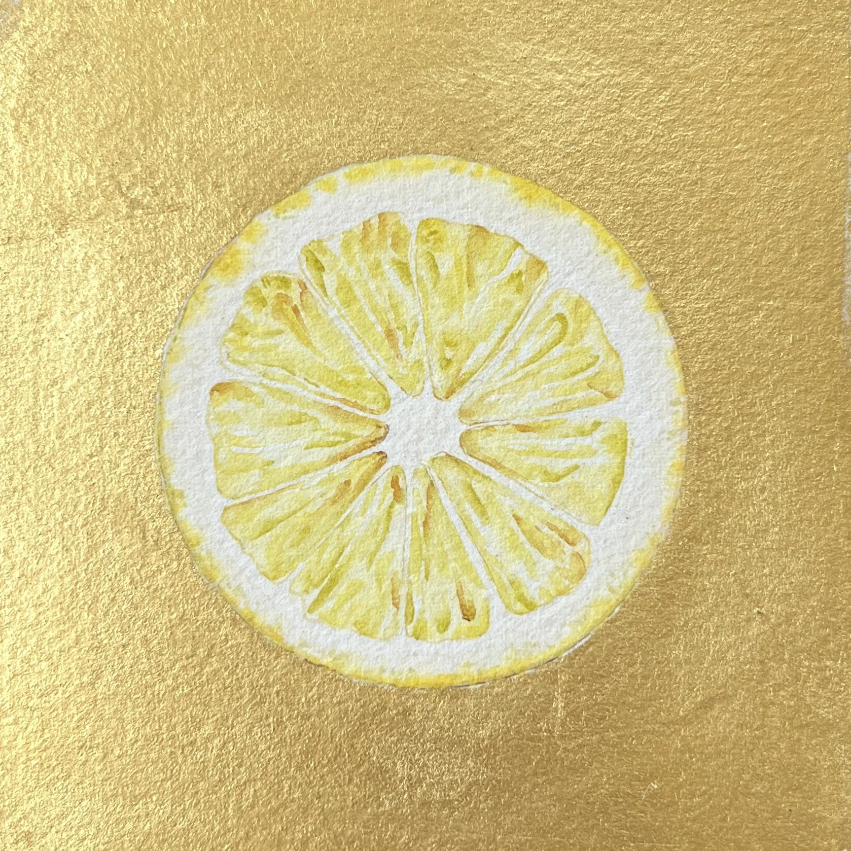 Lemon Gem. Watercolor and 22 karat gold. Matted and framed in a white gallery frame. 10x10 inches.