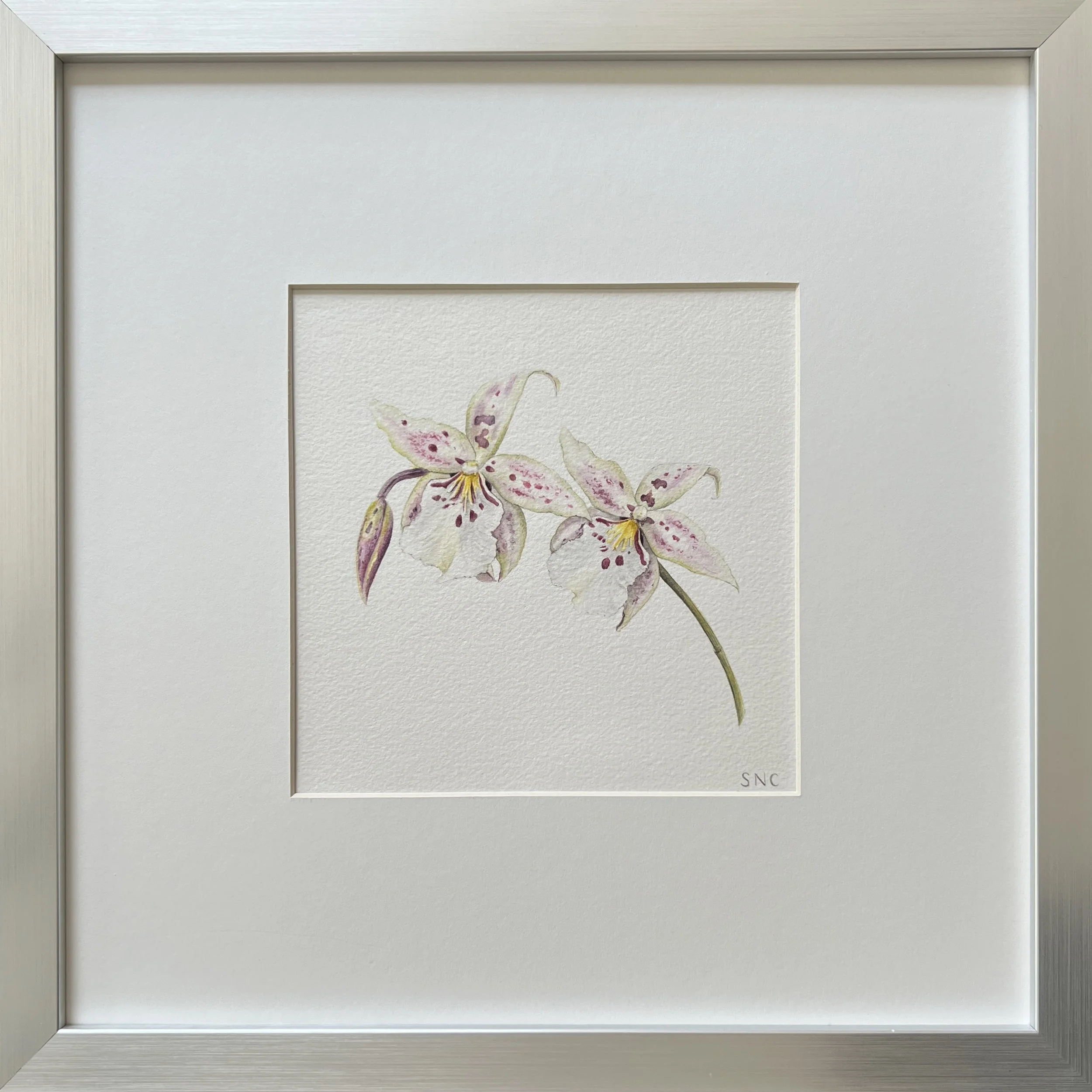Balleara Orchid. Watercolor. Matted and framed in a silver wood gallery frame. 12x12 inches.
