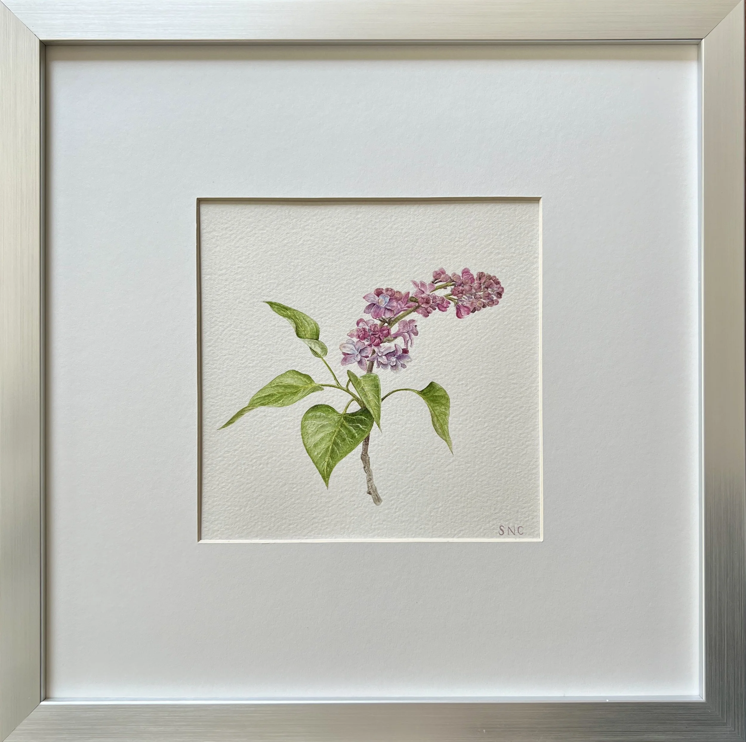 Lilac. Watercolor. Matted and framed in a silver wood gallery frame. 12x12 inches.