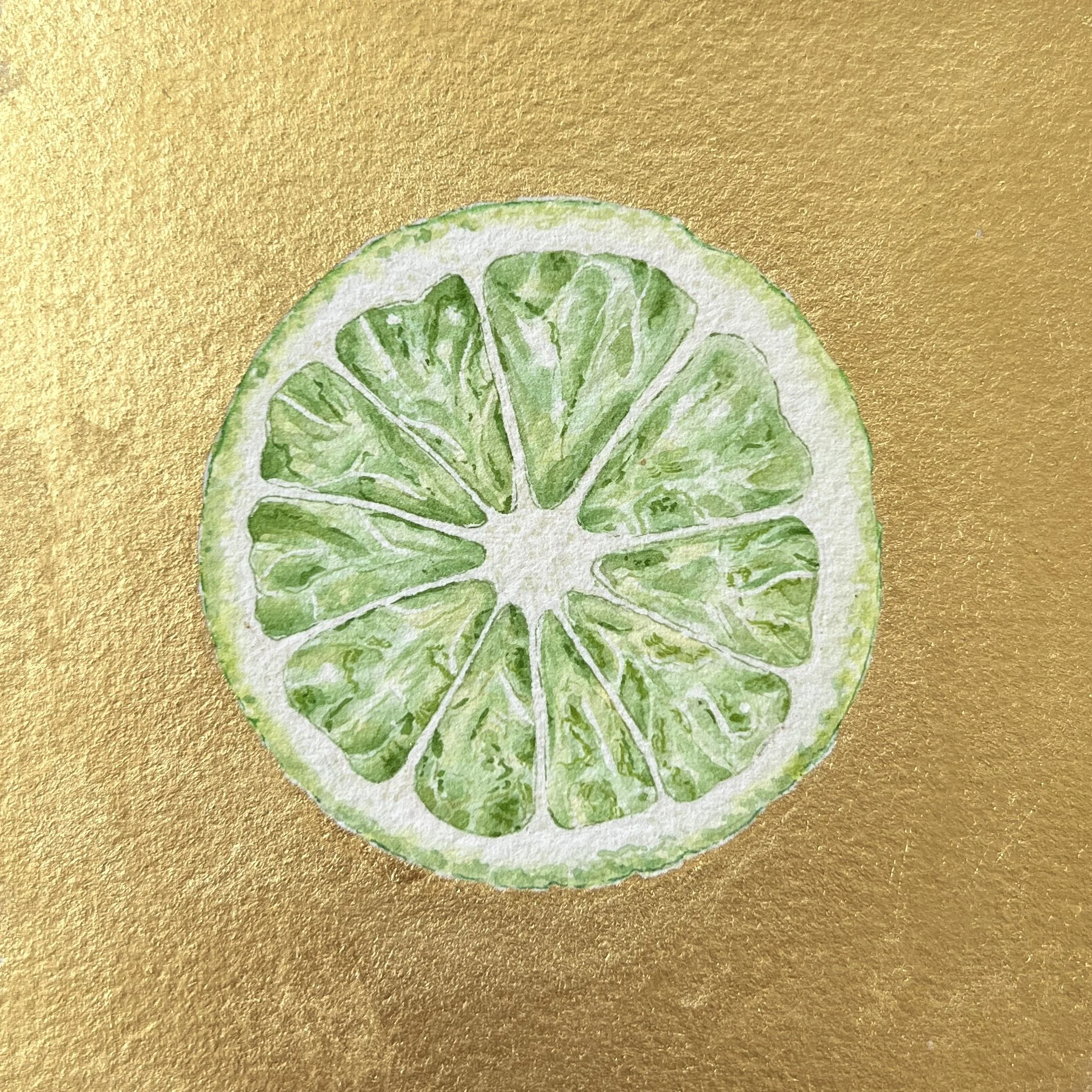 Lime Gem. Watercolor and 22 karat gold. Matted and framed in a white gallery frame. 10x10 inches.