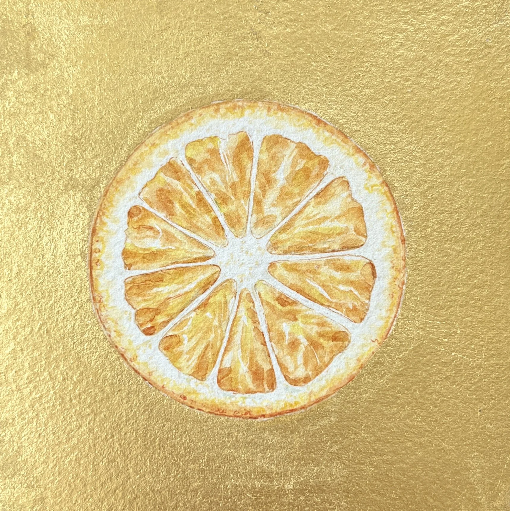 Orange Gem. Watercolor and 22 karat gold. Matted and framed in a white gallery frame. 10x10 inches.