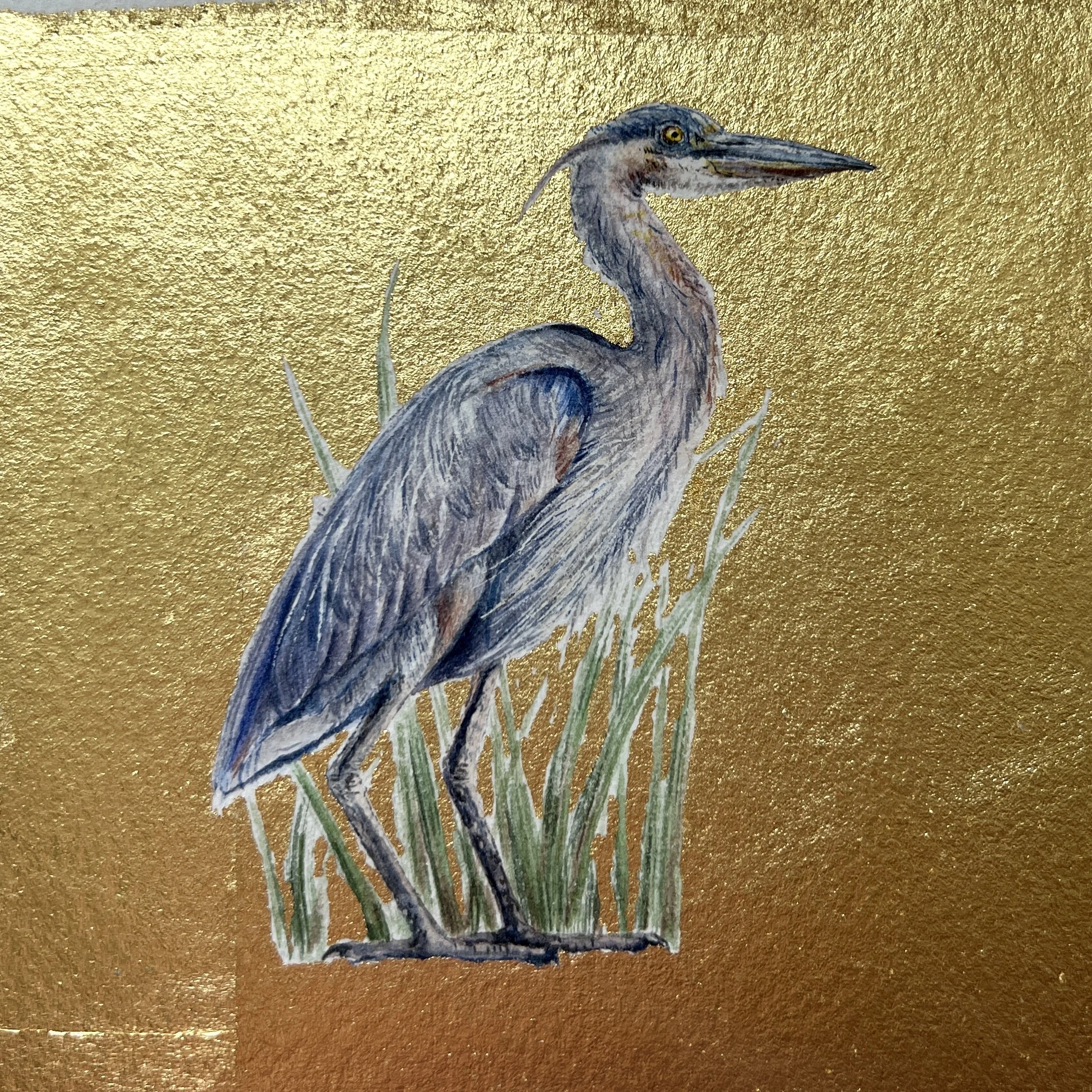 Blue Heron Gem. Watercolor and 22 karat gold. Matted and framed in a white gallery frame. 10x10 inches.