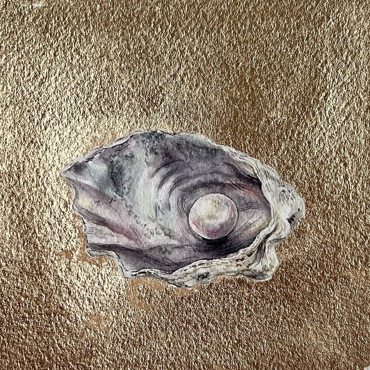 Oyster Gem. Watercolor and 22 karat rose gold. Matted and framed in a white gallery frame. 10x10 inches.