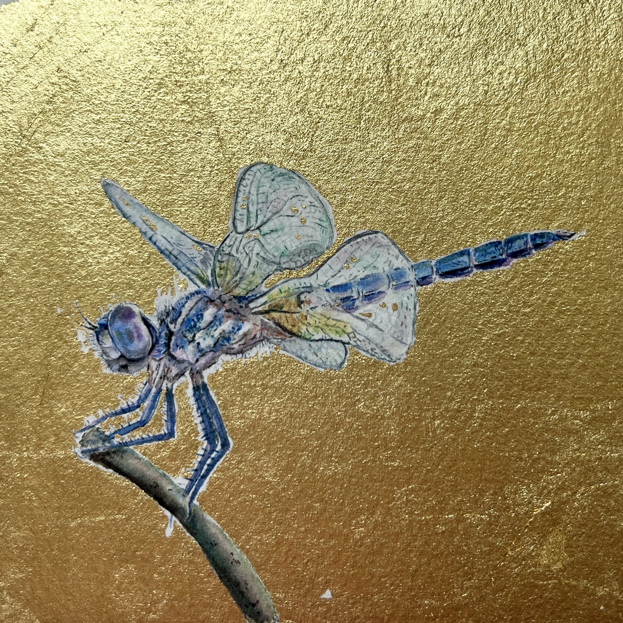 Dragonfly Gem. Watercolor and 22 karat gold. Matted and framed in a white gallery frame. 10x10 inches.