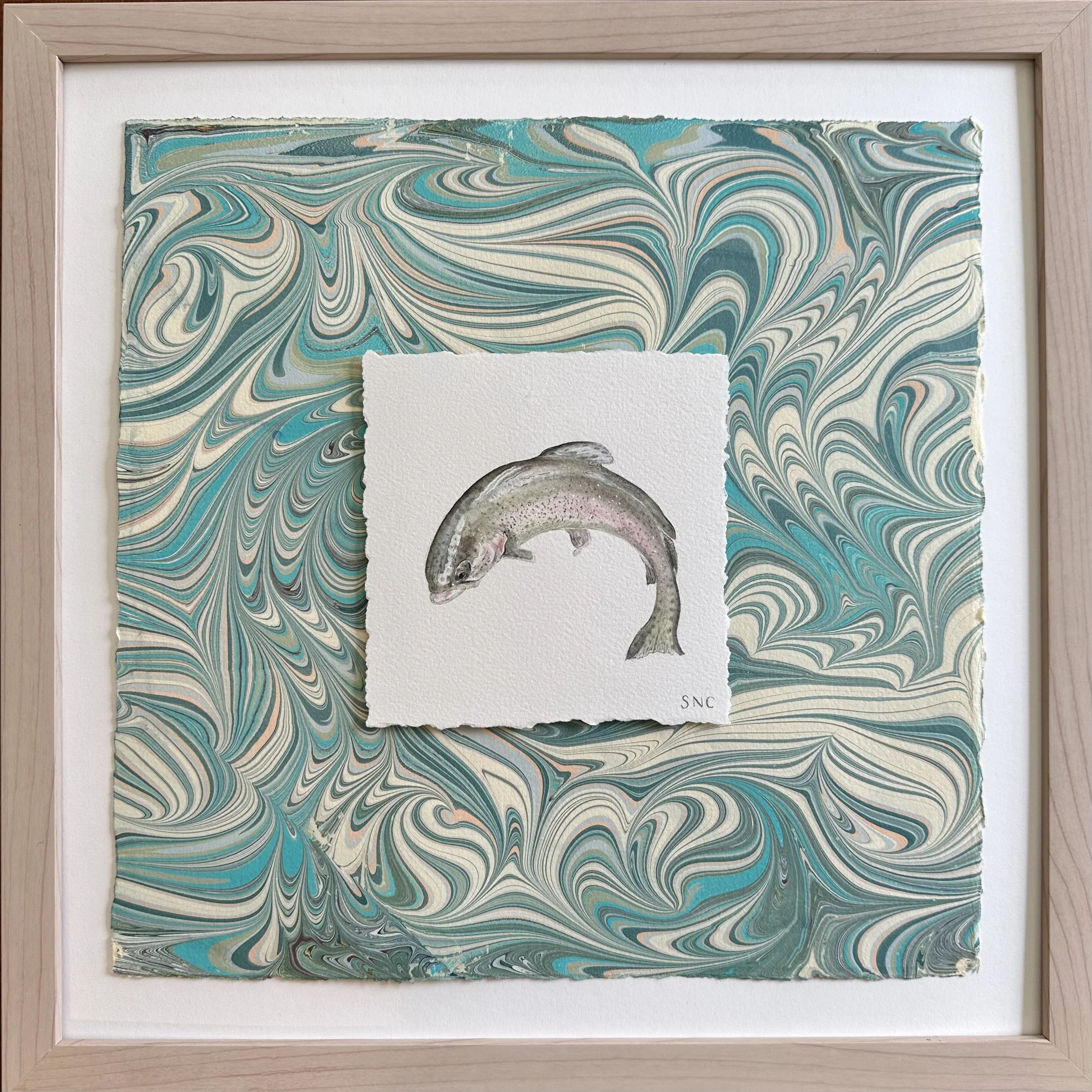 Trout. Watercolor and hand-marbled paper. Float mounted in a natural wood gallery frame. 14x14 inches.