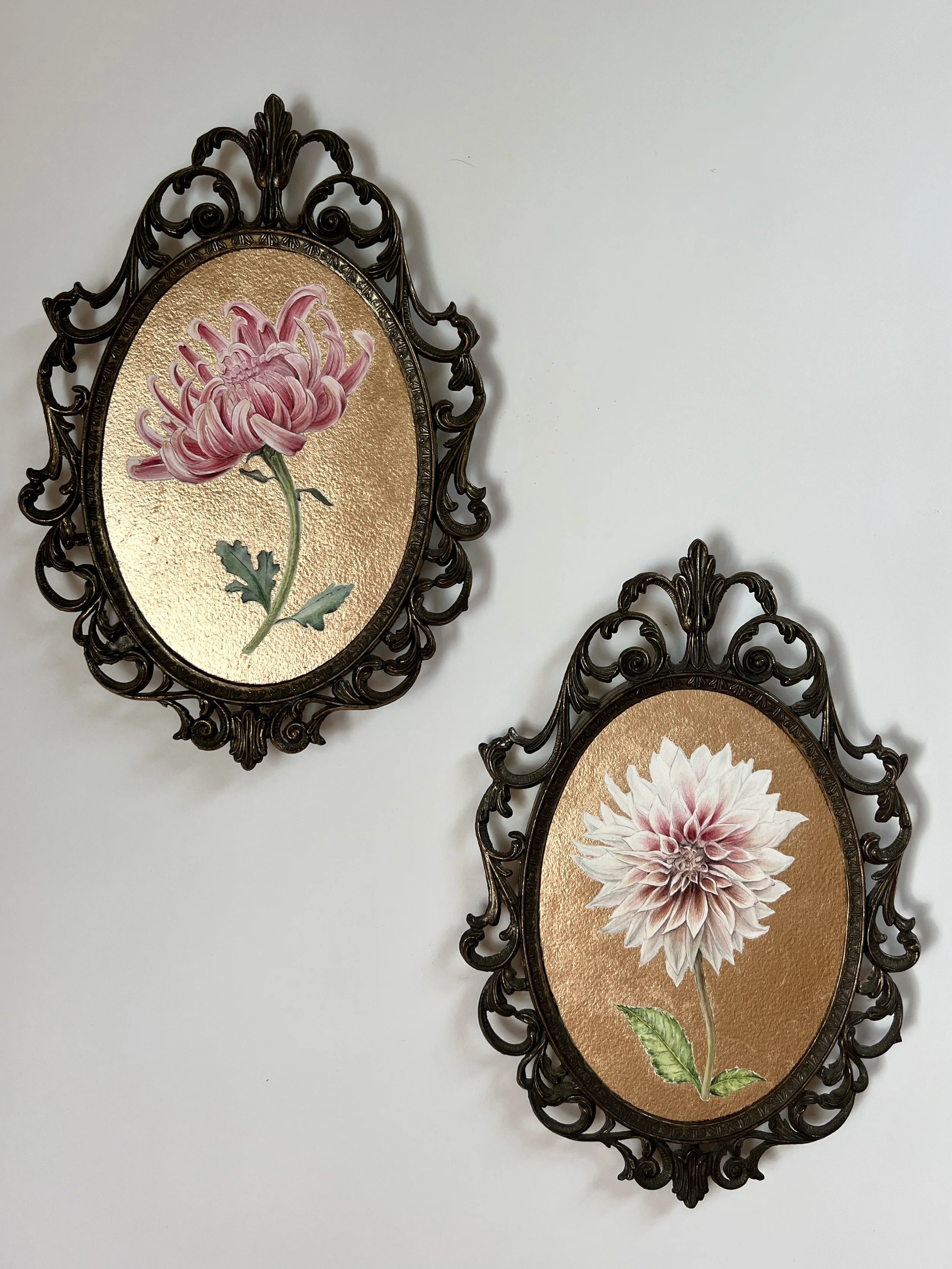 Chrysanthemum Gem and Dahlia Gem. Watercolor and 22 karat rose gold. Antique frames. Approx. 7x10 inches. Available together or separately.