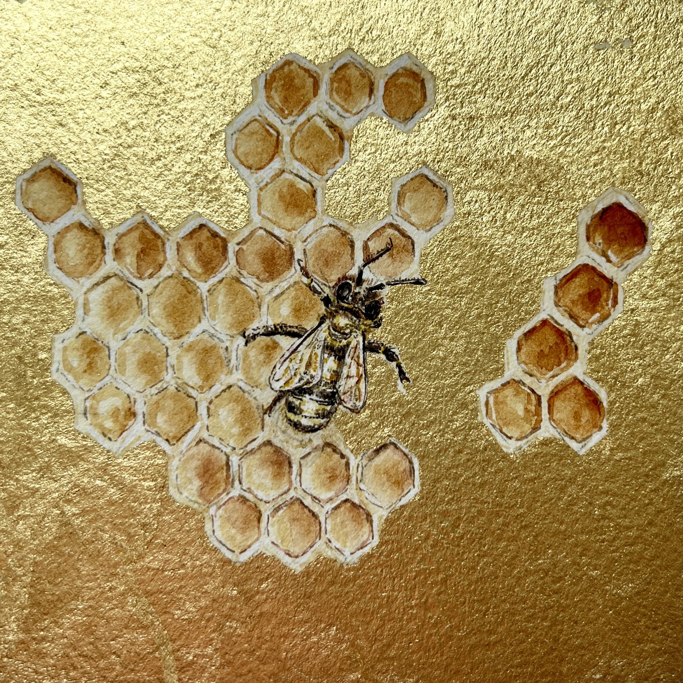 Honey Bee Gem. Watercolor and 22 karat gold. Matted and framed in a white gallery frame. 10x10 inches.