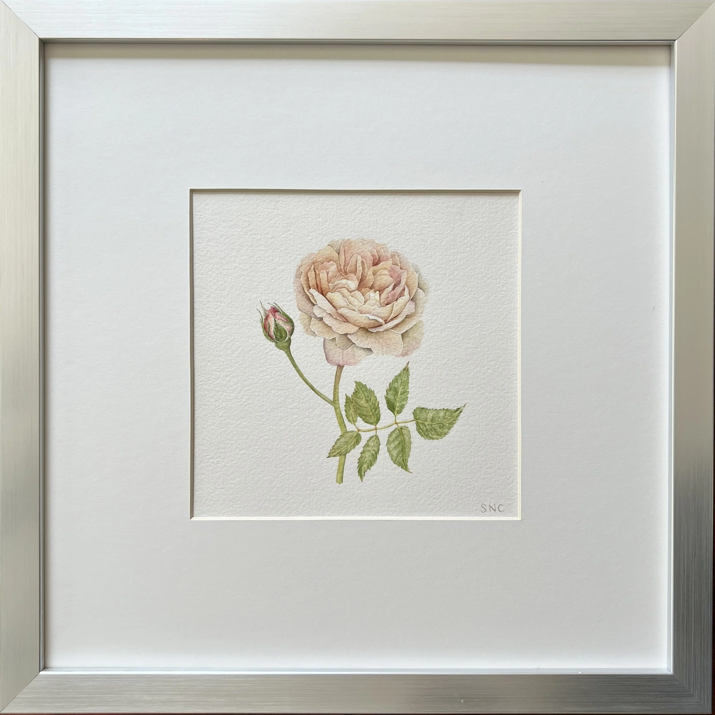Rose. Watercolor. Matted and framed in a silver wood gallery frame. 12x12 inches.